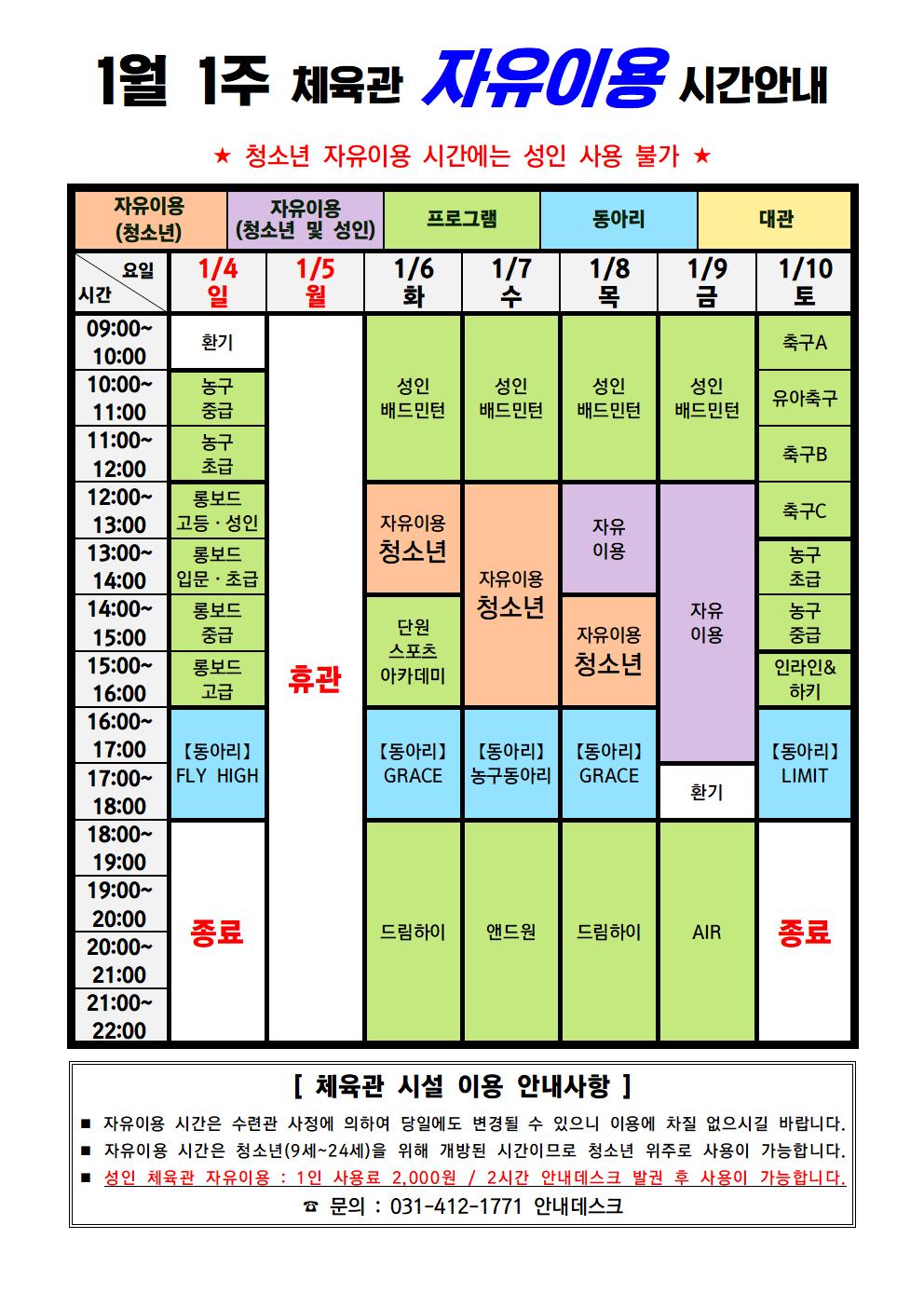 [단원] 2026년 1월 1주 체육관 자유이용 시간안내
